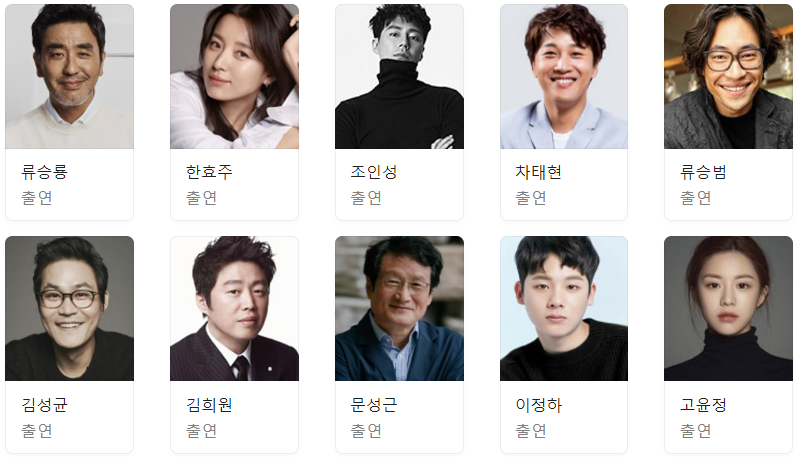 류승룡, 한효주, 조인성, 차태현, 류승범, 김성균, 김희원, 문성근, 이정하. 고윤정, 김도훈, 박희순, 양동근, 김신록, 곽선영, 조복래 배우가 출연합니다.