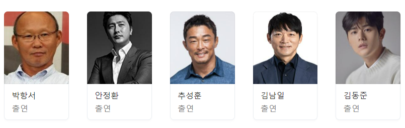 출연진은 박항서, 안정환, 추성훈, 김남일, 김동준입니다.