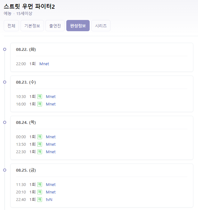 스우파2 재방송 시간표입니다. 실시간이나 재방송을 놓치신 분들은 ott 티빙에서 보시면 됩니다.