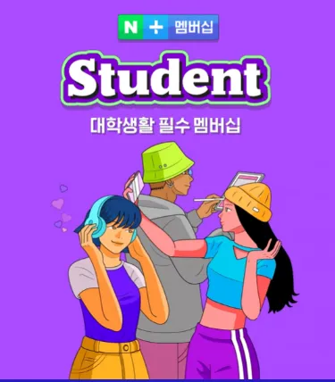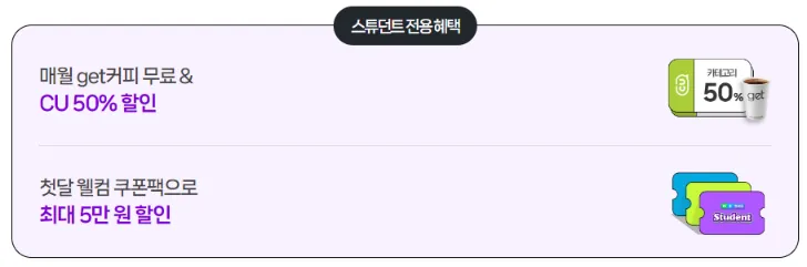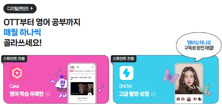 대학(원)생이라면 3개월을 무료로 이용할 수 있어요. 기본혜택뿐만 아니라 매월 get 커피 무료&CU 50% 할인, 첫달 웰컴 쿠폰팩으로 최대 5만원 할인, cake 영어 학습 무제한, snow 고급 촬영 보정까지 대학(원)생들만 누릴 수 있는 스튜던트 혜택도 추가로 있어요!