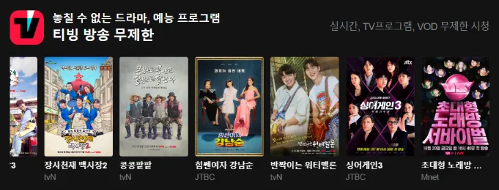 티빙(tving)은 드라마, 예능, 영화, 해외시리즈, 티빙 오리지널 프로그램을 볼 수 있는 OTT서비스입니다.